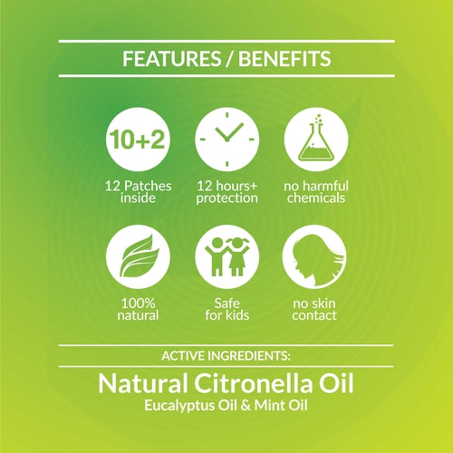 Deet free, Natural anti-mosquito patches, Safe for all age groups, including children, Perfect for indoor and outdoor activities, Effective for more than 12 hours and Easy to use. Protection - Effective for more than 12 hours, safe for kids, contains no deet and perfect for indoor and outdoor. Safe and natural protection from mosquitoes.