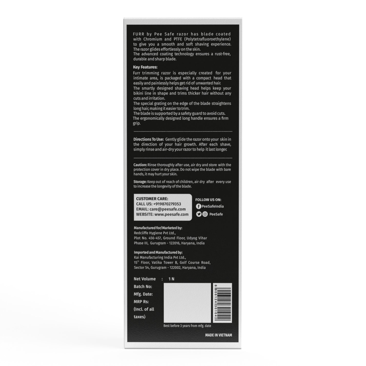The broad range of hygiene essentials of Pee Safe just got better! Introducing Furr Bikini Line Trimmer Razor! A specially designed razor that keeps in mind what your body needs to give you the smoothest and softest shaving experience with its Chromium and PTFE technology. The skin's easy flow ensures your skin stays soft and smooth. The product is specially designed for your intimate area and comes with a compact head that helps you shave the unwanted hair easily and painlessly, keeping your bikini line in shape and keeping thicker hair at bay.