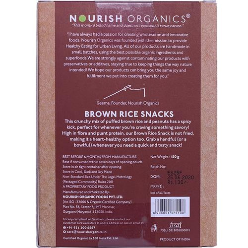 Cuisine - Indian Specialty - Organic Weight -150 Grams Ingredient Type - Vegetarian Brand - ‎Nourish Organics Region Produced In - ‎India Certification - ‎Certified Organic Manufacturer - ‎Nourish Organics Net Quantity -‎150.0 gram Product Dimensions ‎11 x 4.5 x 14.6 cm; 150 Grams Ingredients ‎OrganicPuffed Brown Rice, Organic Peanuts, Organic Bengal Grams/ Chickpeas Serving Size ‎30 Grams