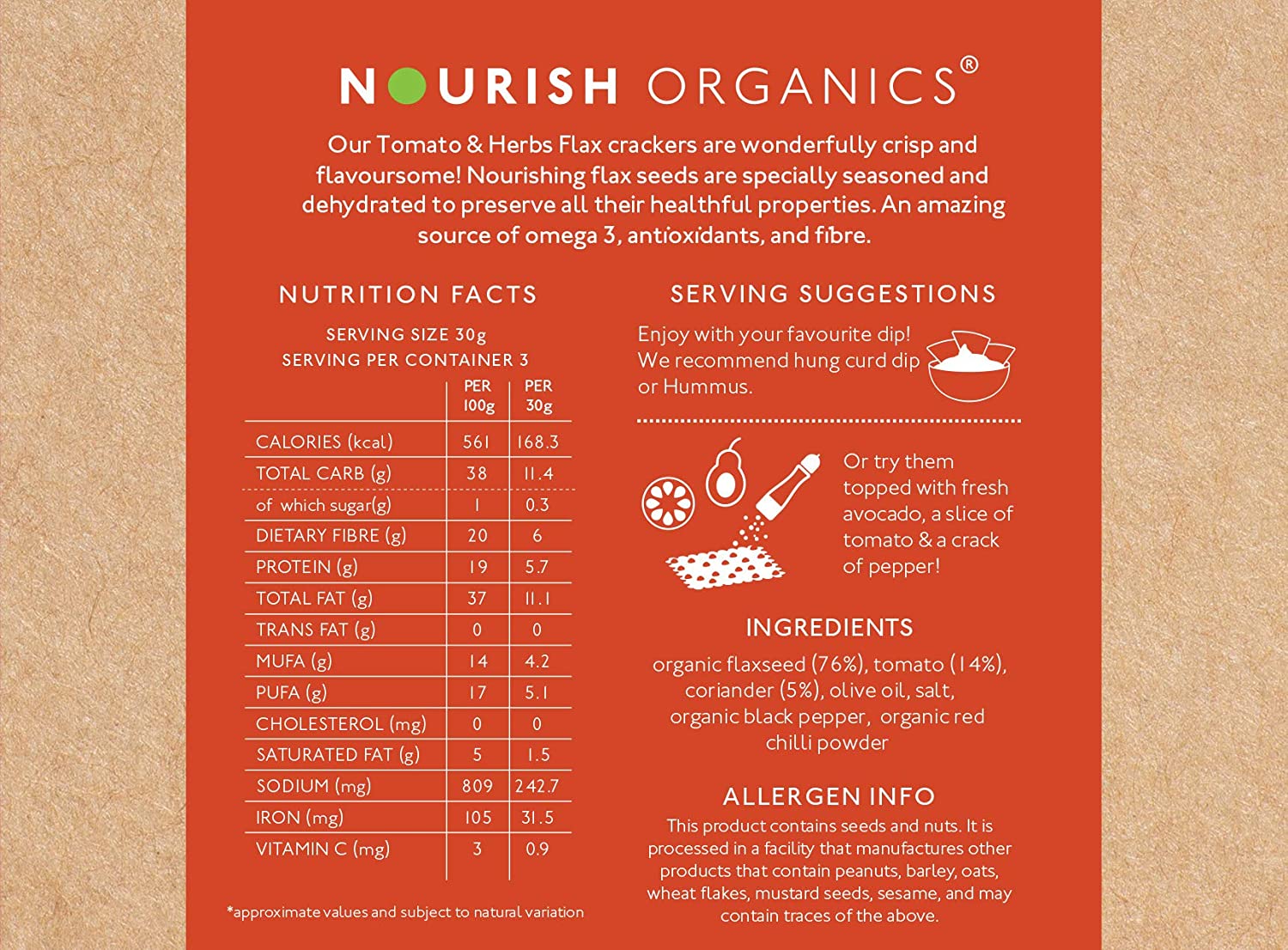 Our tomato & herbs flax crackers are delightfully crisp and tantalising! With the combination of flax seeds, coriander, herbs, lightly drizzled with olive oil and spices. Our crackers are specially seasoned and dehydrated to preserve all their healthful properties. Our crackers are lush with flax seeds, These tiny seeds hoard within omega 3 s fibre, protein and ldl(low density lipoprotein) reducing properties; coriander provides fibre, manganese, vitamin c, vitamin k and protein, while olive oil packs omega-, omega 3 s And vitamin e. Our crackers are an incredible source of omega 3s, antioxidants, and fibre. Try our crackers topped with fresh avocado, a slice of tomato and a crack of pepper for a delicious snack, or munch on as many as you want for you tangy and zesty cravings.