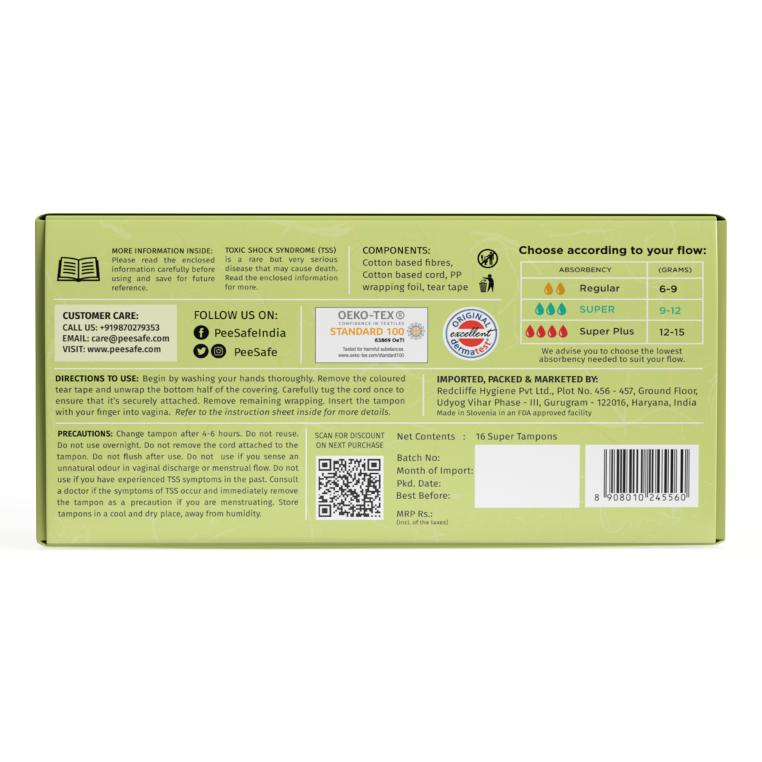 100 percent organic cotton and fully bio-degradable, PeeSafe tampons give you your freedom back in those trouble some days. No hassles, no wetness, no worries - only complete hygiene and freedom. Each tampon is crafted with 100 percent organic cotton which is grown without the use of toxic pesticides and synthetic fertilizers having a low impact on environment. It is biodegradable and free from chlorine bleach, dyes, and other synthetics. Pee Safe tampons are extra-soft, natural, easy to insert and even eco-friendly when disposed of. SUPER: If your flow is medium to heavy, try using Super absorbency tampons.