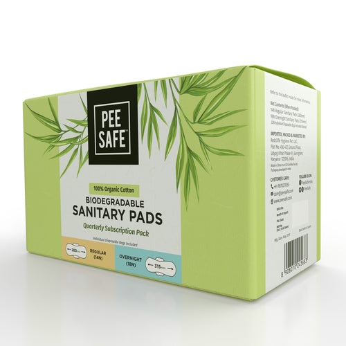 100% ORGANIC COTTON, BIODEGRADABLE SANITARY PADS - Pee Safe quarterly subscription box is created to put your monthly payouts for sanitary pads to rest. With this subscription, you're covered for a good 3 months at a stretch ensuring your emergency run to the chemist should not happen again. - With a subscription box, you save 20% on each every pad. This is a more economical option. With just one click, you subscribe to a life long, timely delivery of Biodegradable sanitary pads that ensures a comfortable period. - This Box comprises of 14N of Regular 100% Organic Cotton, Biodegradable Sanitary Pads, 18N of Overnight 100% Organic Cotton, Biodegradable Sanitary Pads and 32N of disposable bags for your used sanitary pads making sure the disposal process is easy and a comfortable experience to you. - The regular variant is 280mm long and the overnight variant is 315mm long for optimum coverage and provides full day protection.