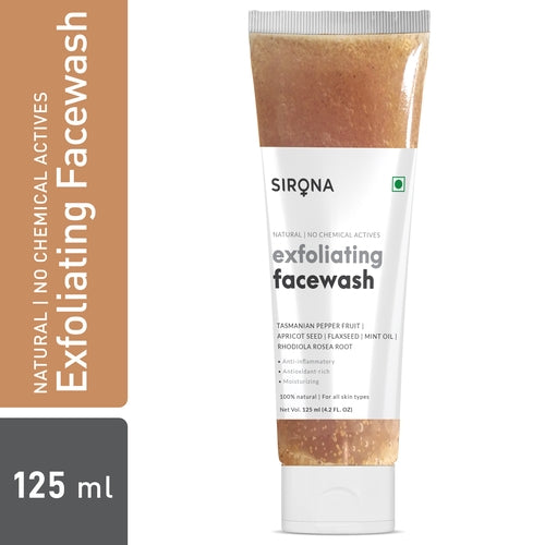 - Features: Sirona’s exfoliating face wash is a superfood for your skin with real exotic oils - Natural Ingredients: Enriched with the goodness of Tasmanian pepper fruit extracts, Rhodiola Rosea root extracts, Flaxseeds, Apricot seed powder and mint o