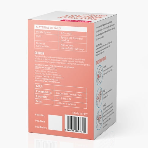 Now, use Sirona 'Premium Disposable Breast Pads' for complete peace of mind during delicate & special period of breast feeding. Sirona Breast pads are a real blessing for ladies while lactation. The continuous wetness in the breastfeeding span becomes very uncomfortable and embarrassing for naive moms. They sometimes have to cope with redness and soreness on the breasts due to rashes developed by over humidity plus it also works as invitation for fungal infection if not taken proper care. Sirona's Premium Disposal Breast Pads are made up of very smooth and has very good absorbent quality. It absorbs up-to 80ml of milk drips. Comfortable and discreet,unique breast pads specially designed to help you stay dry and comfortable.